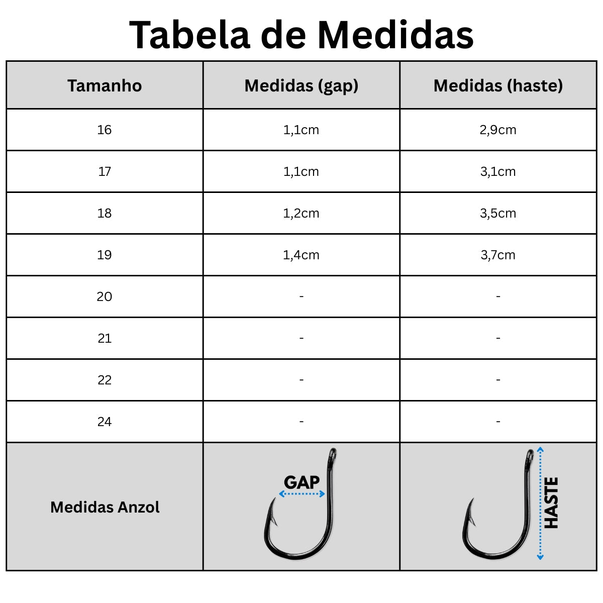 Ideal para pescadores que buscam confiabilidade e desempenho, o anzol já vem em cartelas com diversas unidades (normalmente 25 ou 50 peças) e tamanhos variados (ex: do nº 16 ao nº 24).