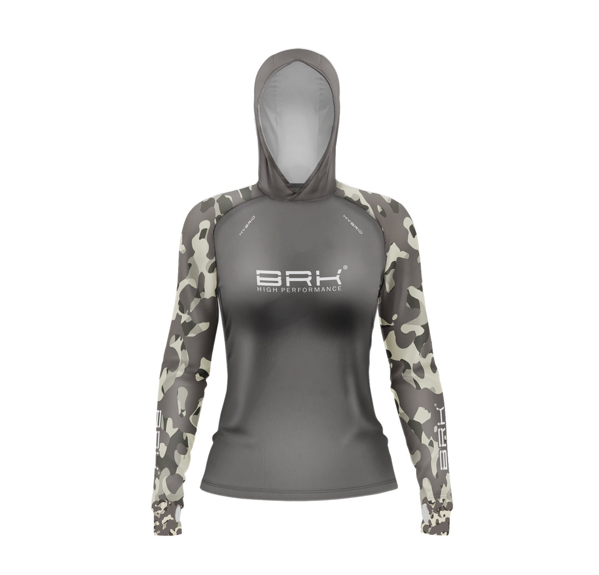 Camisa de Pesca Feminina Brk com Luva e Capuz Hybrid Camuflada Cinza e Verde com Proteção Solar UV50+
