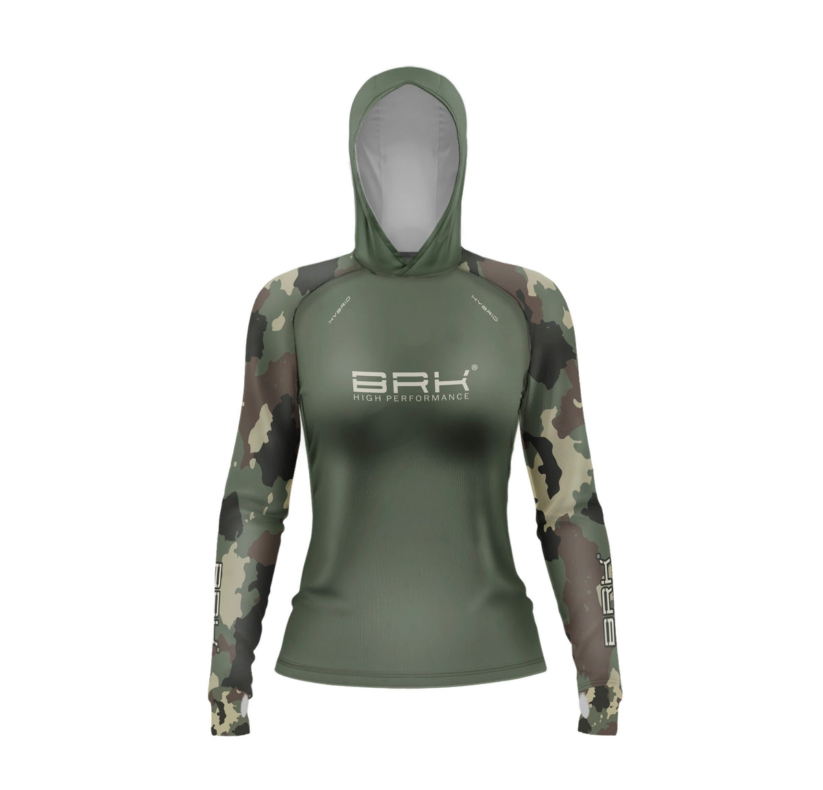 Camisa de Pesca Feminina Brk com Luva e Capuz Hybrid Camuflada Verde com Proteção Solar UV50+