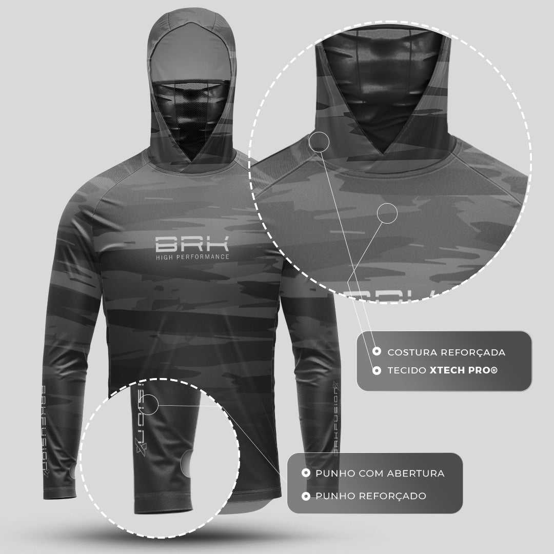 A bandana Black Mask integrada na camisa é feita com microfuros estrategicamente posicionados, permitindo uma respiração fácil e confortável. Por possuir elastano, vai se esticar e não apertar seu rosto além de garantir a proteção solar UV50+.