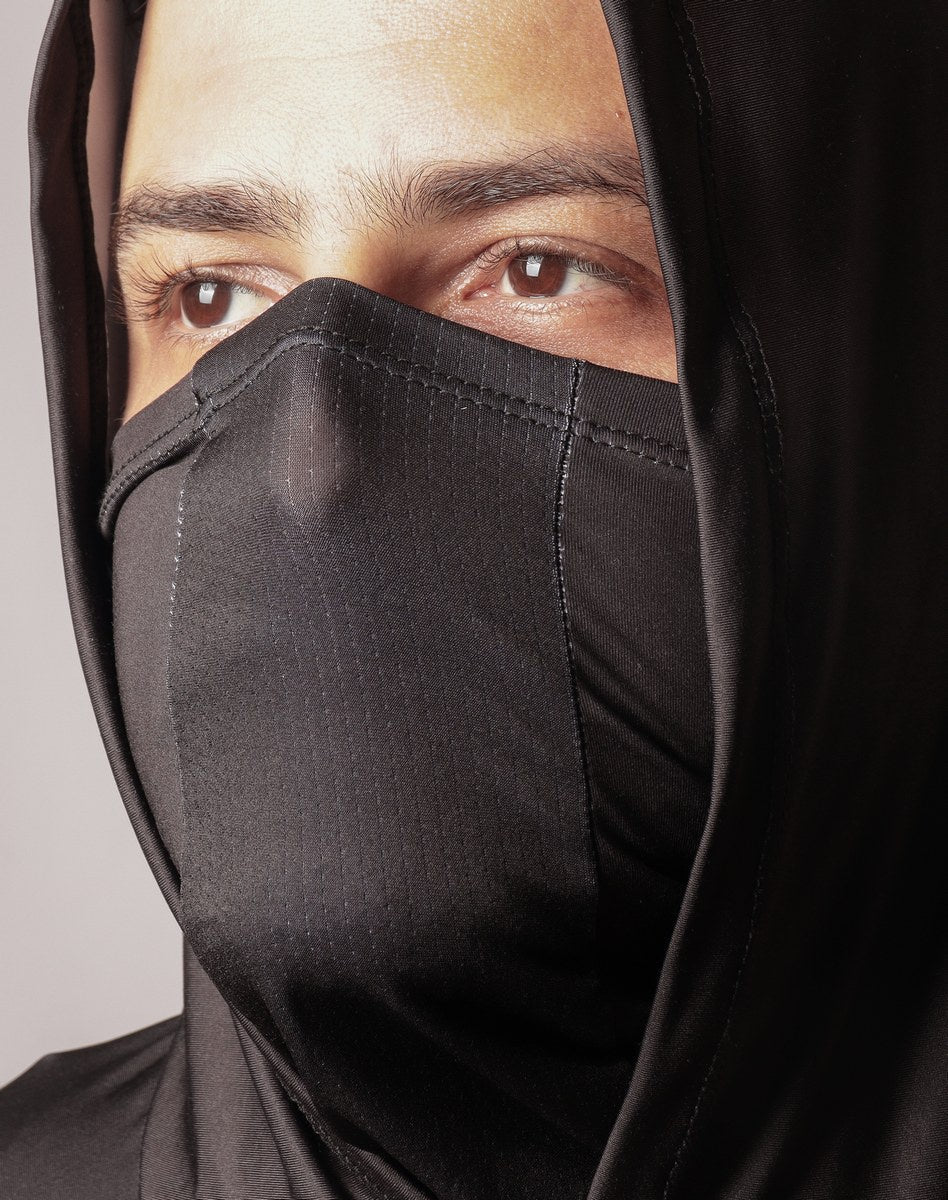 A bandana Black Mask integrada na camisa é feita com microfuros estrategicamente posicionados, permitindo uma respiração fácil e confortável. Por possuir elastano, vai se esticar e não apertar seu rosto além de garantir a proteção solar UV50+.