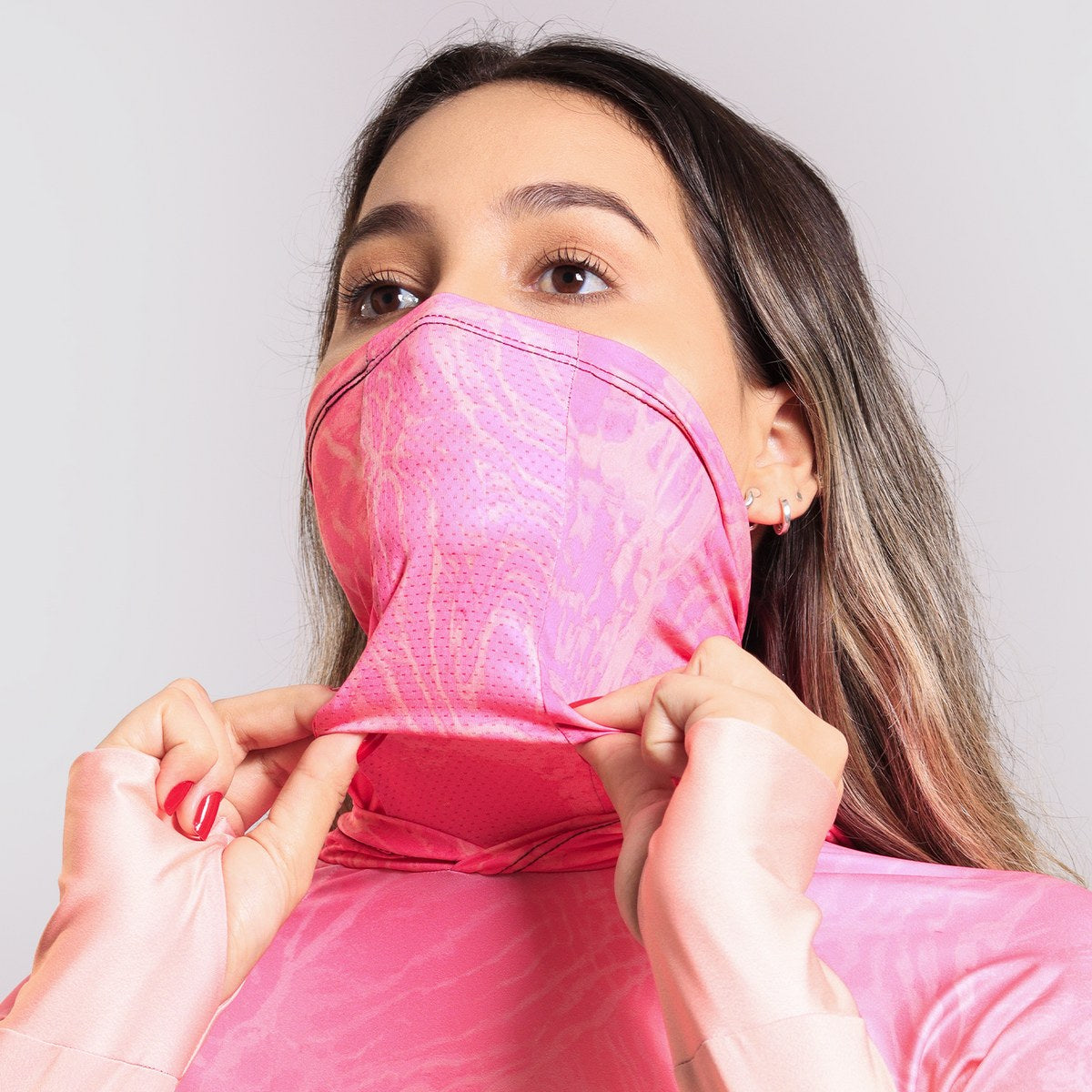 A bandana Black Mask integrada na camisa é feita com microfuros estrategicamente posicionados, permitindo uma respiração fácil e confortável. Por possuir elastano, vai se esticar e não apertar seu rosto além de garantir a proteção solar UV50+.