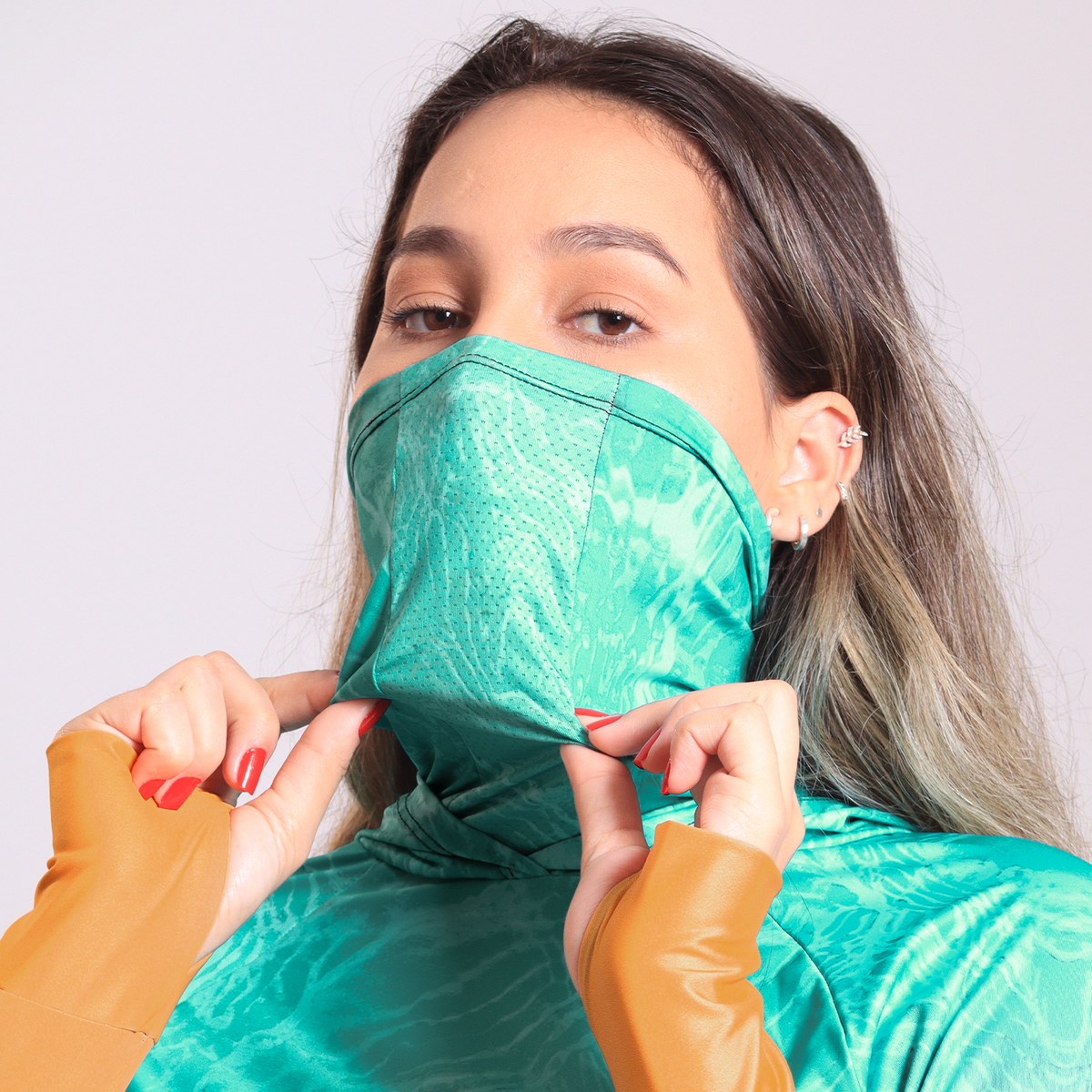 A bandana Black Mask integrada na camisa é feita com microfuros estrategicamente posicionados, permitindo uma respiração fácil e confortável. Por possuir elastano, vai se esticar e não apertar seu rosto além de garantir a proteção solar UV50+.